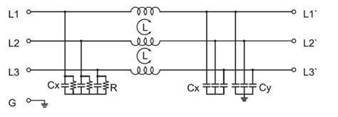 3 Phase Line Filter Schematic. Fcl's most economical and compact 3 phase filter provides both differential and common mode performance in a section circuit. Horizontally mounted common mode choke;